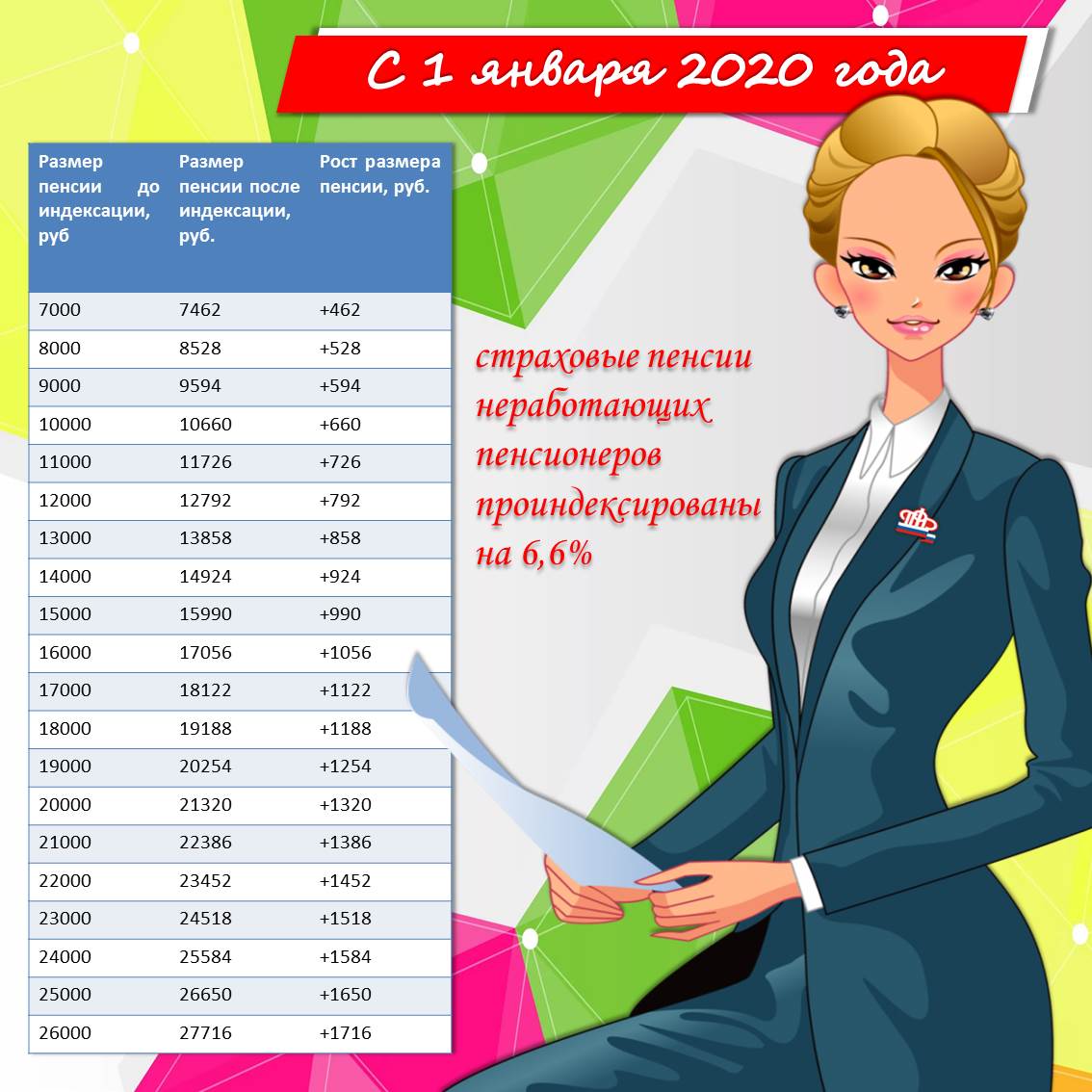 С 1 января 2020 года страховые пенсии неработающих пенсионеров проиндексированы на 6,6%, что выше показателя прогнозной инфляции по итогам 2019 года. Размер фиксированной выплаты и стоимость пенсионного коэффициента, исходя из которых складывается страховая пенсия, после индексации составляют 5 686,25 руб. и 93 руб. соответственно.