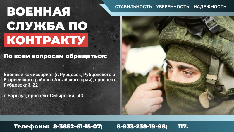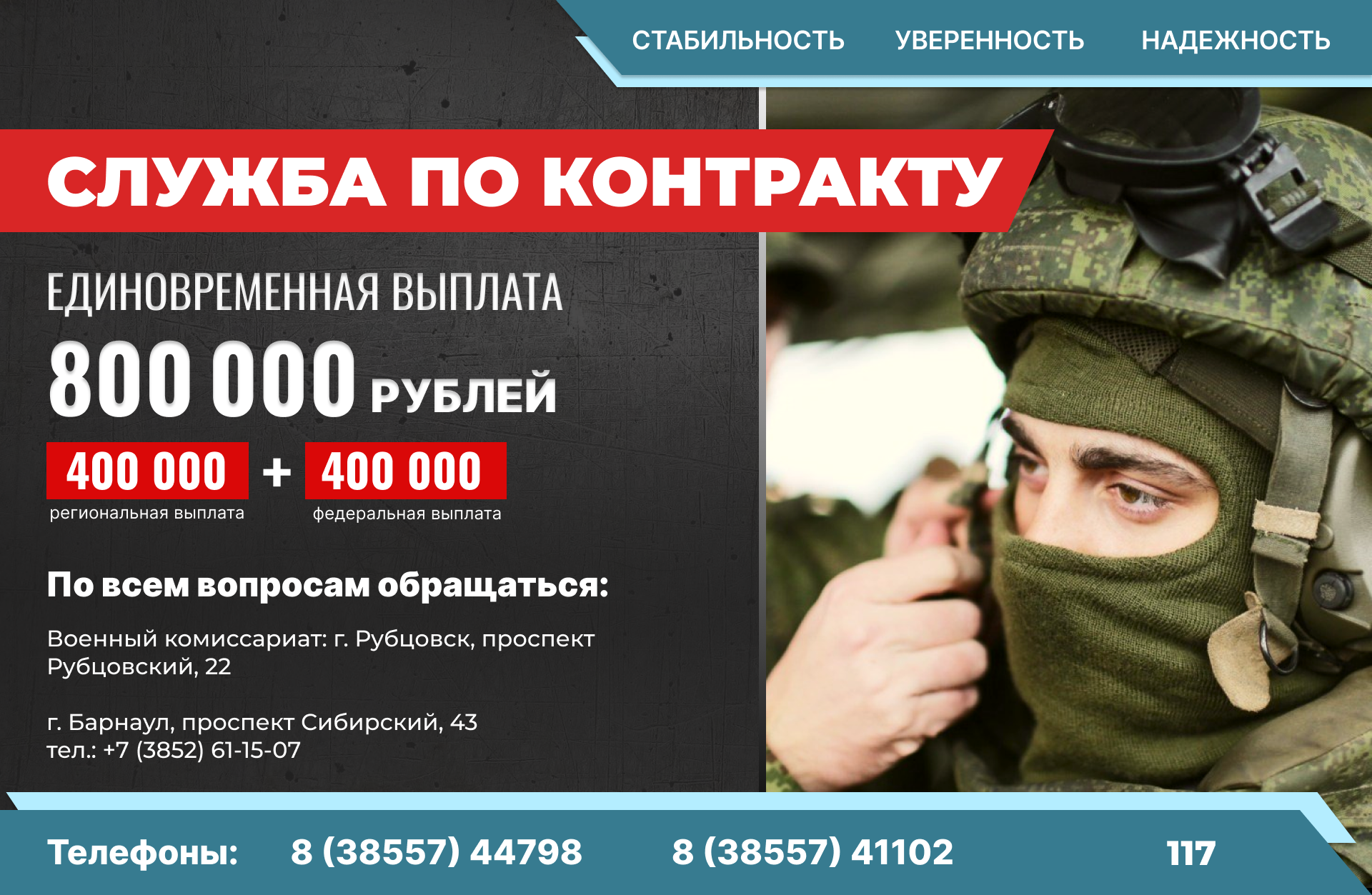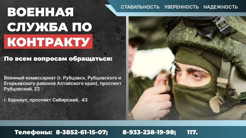 Пункты отбора на военную службу по контракту: - г. Рубцовск, проспект Рубцовский, 22; тел.: +7 (38557) 4-47-98; 8 (38557) 43102; 8 999 475 6715 - г. Барнаул, проспект Сибирский, дом 43; тел.: 8-3852-61-15-07, 8-933-238-19-98; ☎единый федеральный номер – 117.