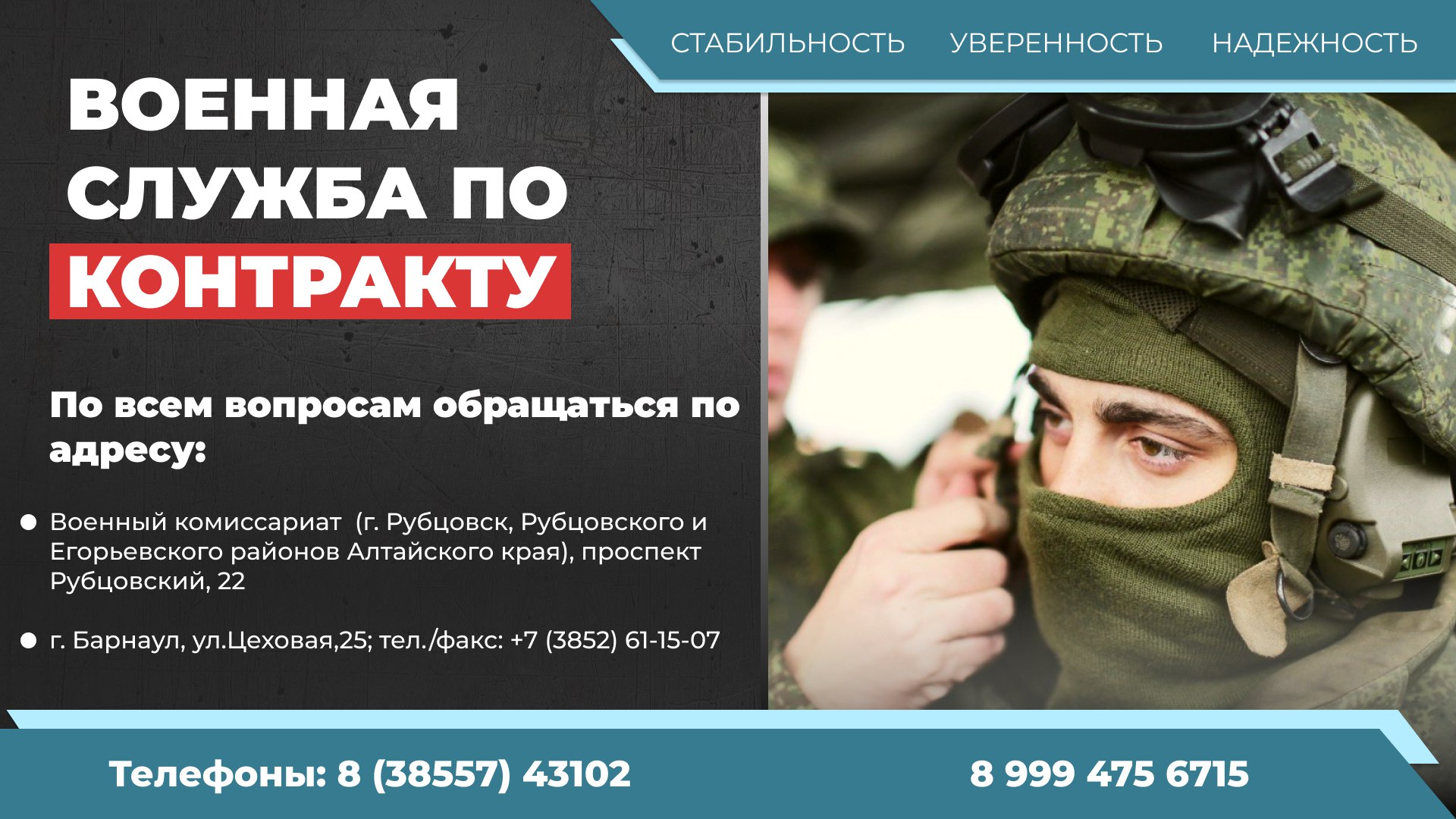 Пункты отбора на военную службу по контракту: г. Рубцовск, пр-кт Рубцовский, 22; тел.: +7 (38557) 4-47-98; 8 (38557) 43102; 8 999 475 6715.