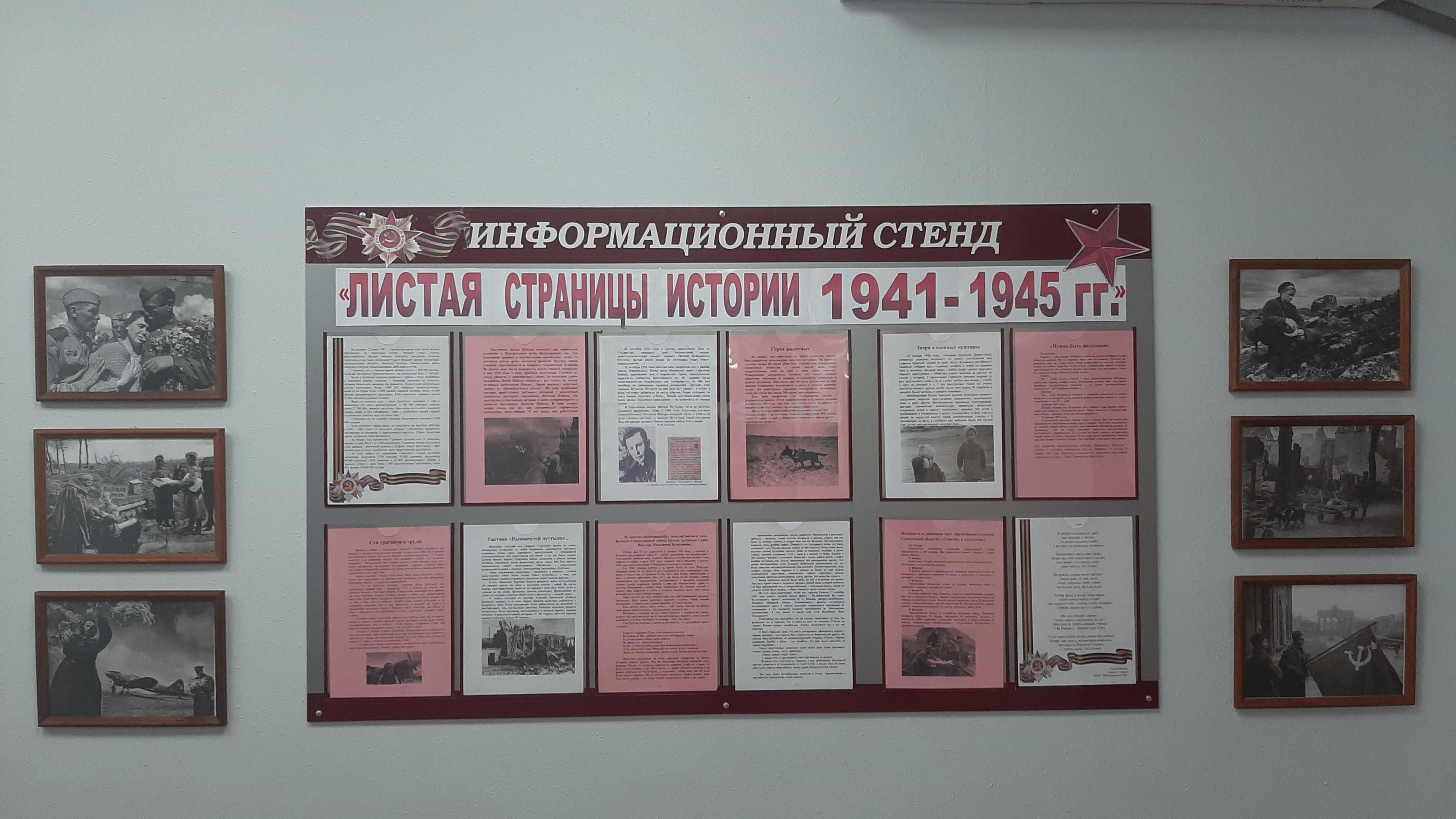 На стенде размещены материалы, посвященные военным страницам нашей истории: фотографии военных лет, воспоминая очевидцев, стихи о войне, факты и события военного времени.
