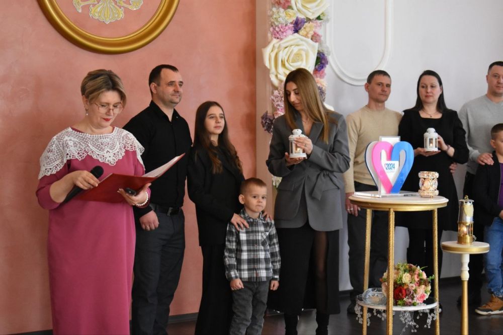 Специалист отдела ЗАГС вручила счастливым родителям свидетельство о рождении дочери, поздравления Губернатора Алтайского края А. Б. Карлина и Министра юстиции Алтайского края К.Е. Портнягина.
