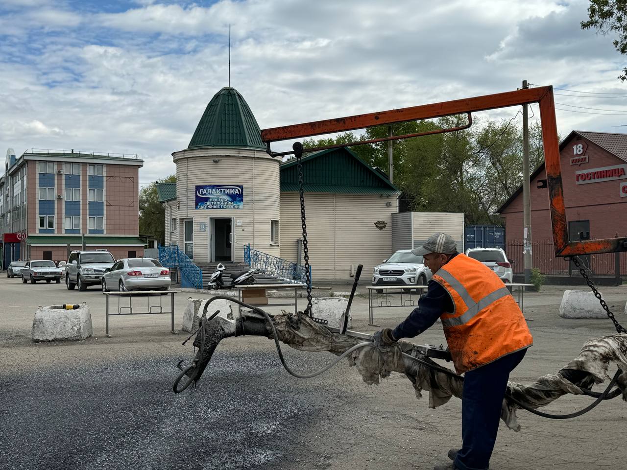 Выполнялся ямочный ремонт дороги на ул. Пролетарской и привокзальной площади струйно-инъекционным методом с помощью машины «Бецема».