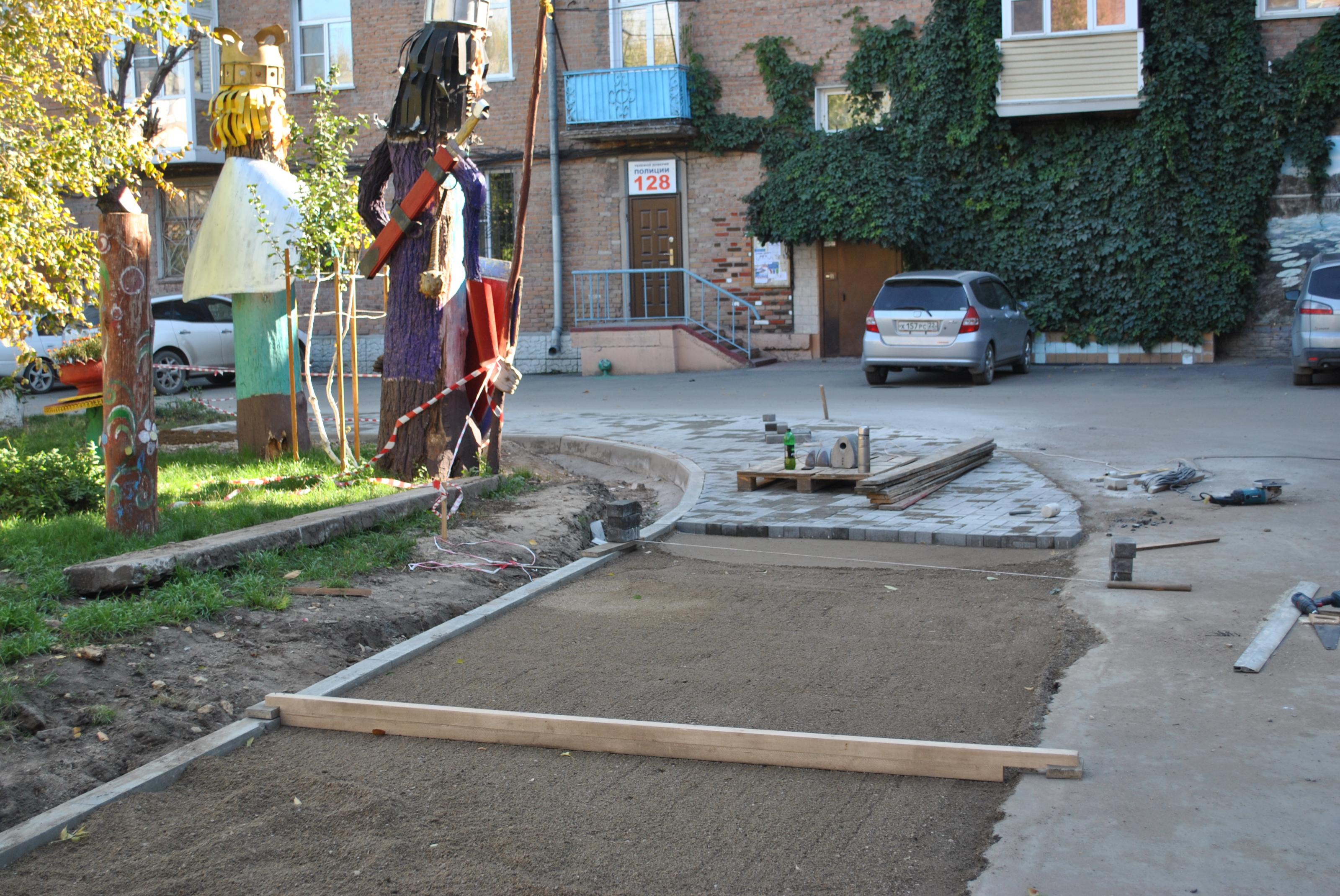 8.ул.Дзержинского, 13 – ведутся работы по укладке тротуарной плитки (часть уже уложена), установлен бордюрный камень, обустроены парковочные места, выполнен демонтаж старых деревьев.