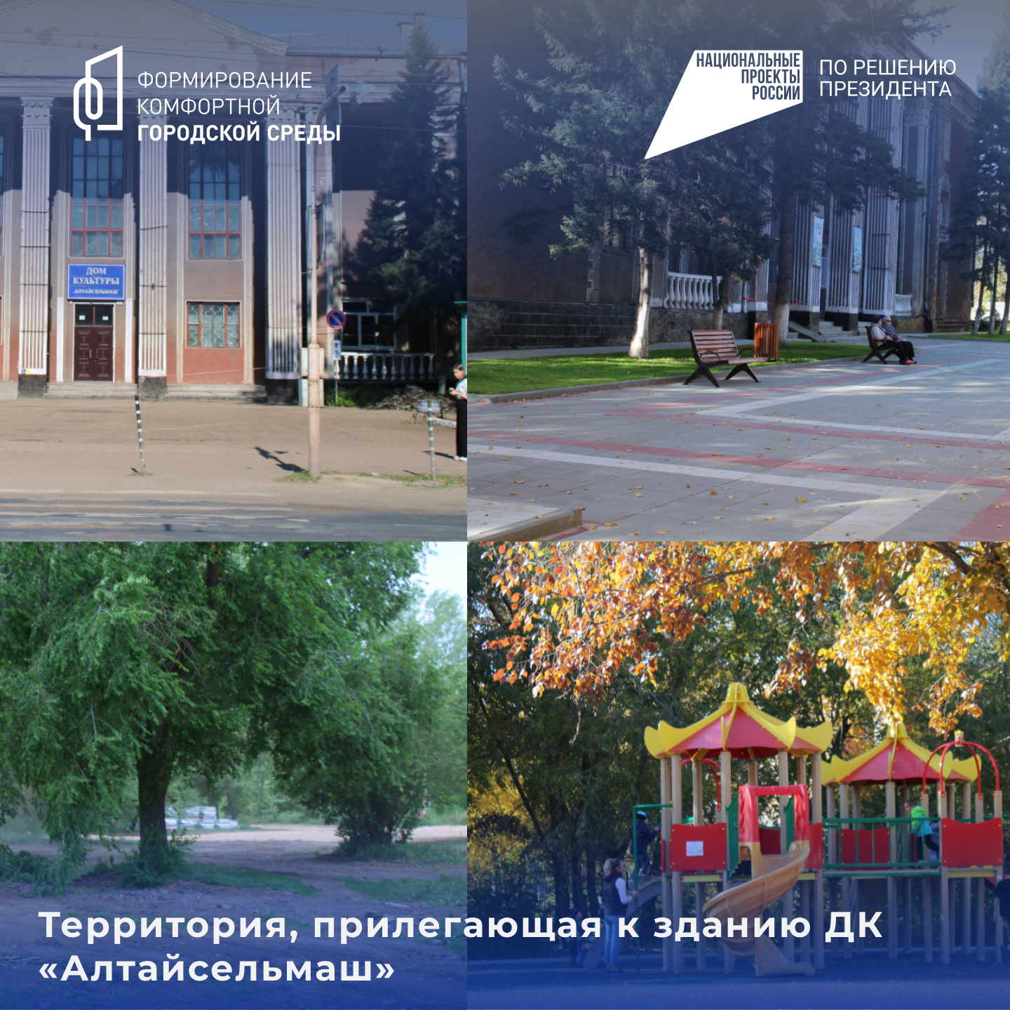 Благодаря федеральной программе "Формирование комфортной городской среды" нацпроекта "Жилье и городская среда" в Рубцовске в 2023 году благоустроено три общественные территории. Одна из них – прилегающая территория ДК "Алтайсельмаш". В рамках программы сделана детская, спортивная и скейт-площадки, кроме того, для жителей установлены красивые и удобные лавочки, качели, урны, обустроены дорожки, посажены саженцы деревьев и газон. Благоустроенная площадка стала одним из любимых мест для прогулок с детьми у рубцовчан.
